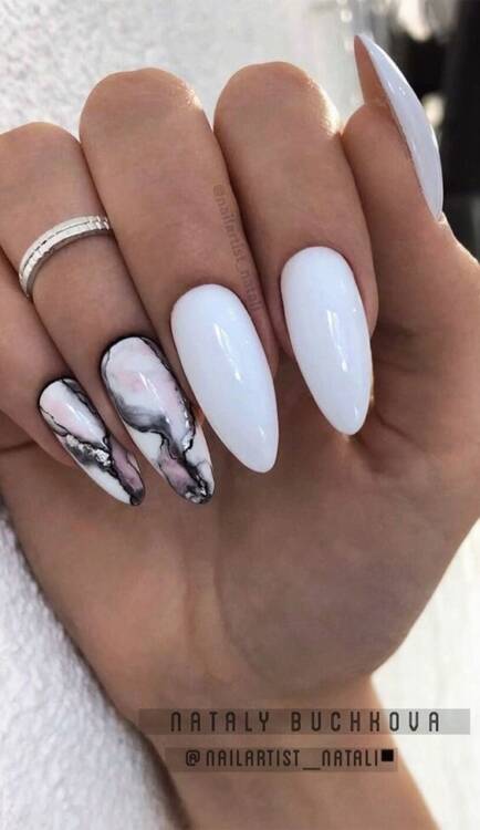 Абстрактні лінії або серпанок з різних відтінків лаку. Обидва прийоми дизайну ідеально доповнять білосніжні нігтики. У галереї добірка красивих, чарівних ідей манікюру.