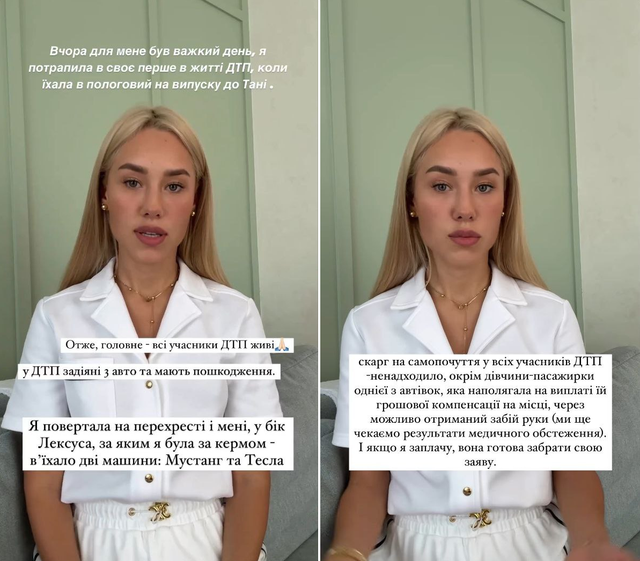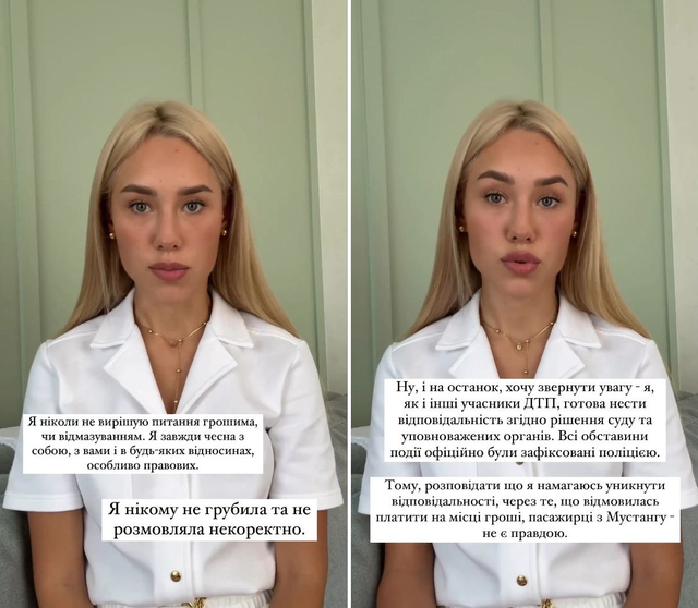 Я ніколи не вирішую питання грошима. Я завжди чесна в правових відносинах. Ми одразу показали всі документи. Я, як і всі учасники ДТП, готова нести відповідальність згідно з рішенням суду та уповноважених органів. Усі матеріали були надані представникам поліції.