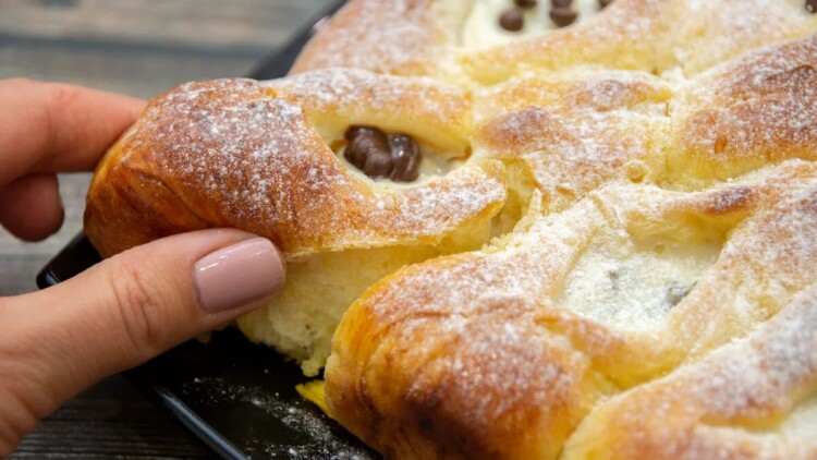 Одні з найсмачніших булочок із сиром готові. Дістаємо їх з духовки і духовку відразу вимикаємо, вона повинна трохи охолонути. У центр кожної гарячої булочки заливаємо крем. Знову їх ставимо в духовку, але вже в вимкнену, в теплу, буквально на 7-10 хвилин для того, щоб схопився крем.