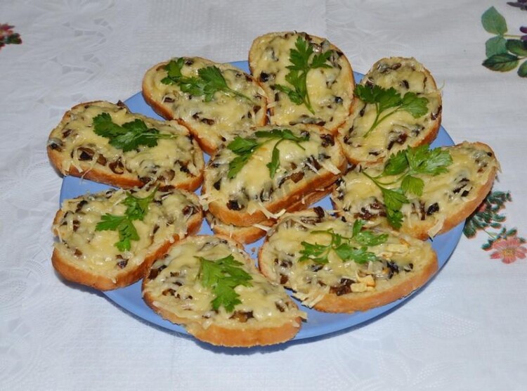 Подаємо гарячими. Хлібець знизу хрумтить, сирок розплавився, а всередині ніжні грибочки. Смакота!