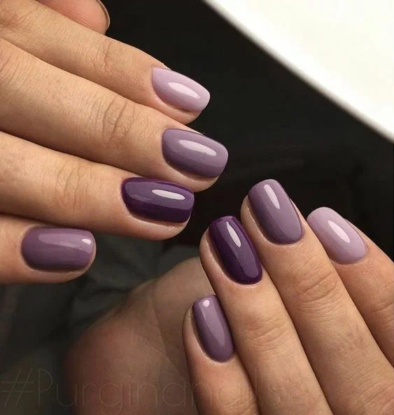 Різні відтінки фіолетового гармонійно виглядають в одному дизайні манікюру. Додати святковості та блиску допоможуть блискітки на одному або відразу кількох нігтях.