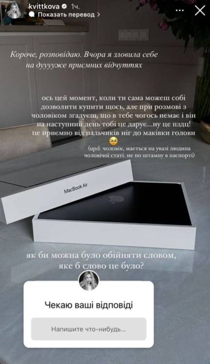 Зловила себе на дуже приємних відчуттях. Ось цей момент, коли ти сама можеш собі дозволити купити щось, але при розмові з чоловіком згадуєш, що в тебе чогось немає, і він наступного дня тобі це дарує… Чоловік, мається на увазі, – людина чоловічої статі, не по штампу в паспорті,