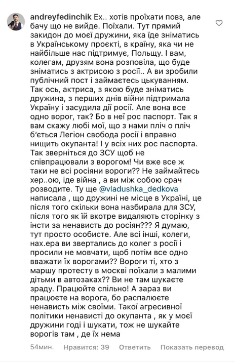 «Вам, колегам, друзям, вона розповіла, що зніматиметься з актрисою з росії. А ви зробили публічний пост і займаєтесь цькуванням» – різко зазначив Андрій Федінчик.