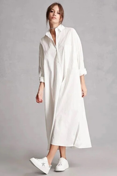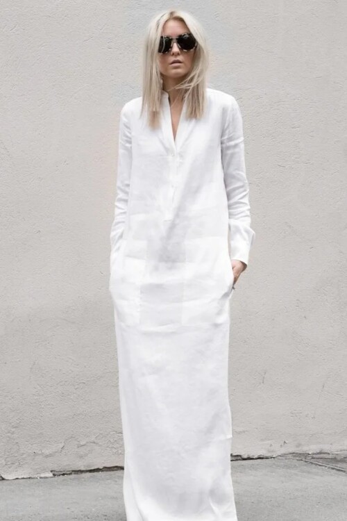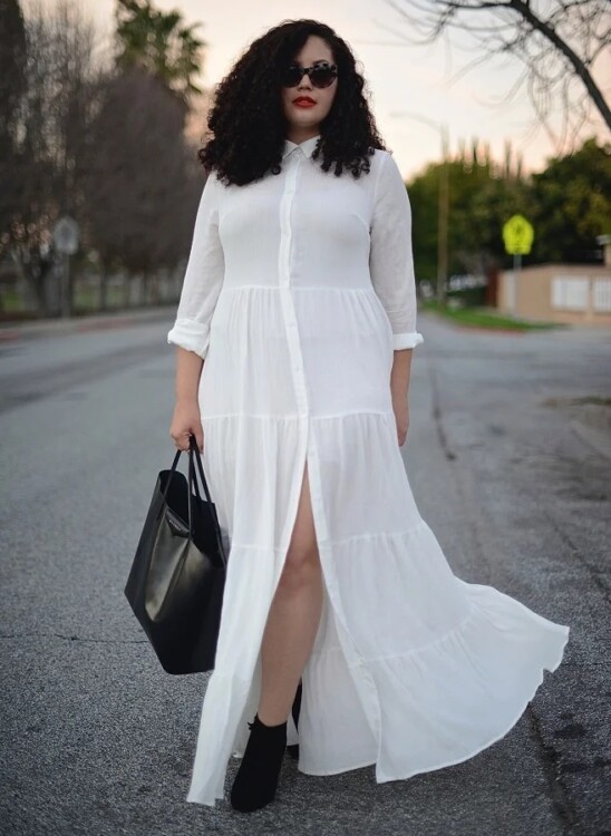 Ніхто не відмовиться від довгої широкої сукні з відкритими плечима. Її можна надягати як з поясом, підкреслюючи талію, так і без нього. В якості взуття підійдуть кеди, білі кросівки, Мюлі, босоніжки і влітку шльопанці.