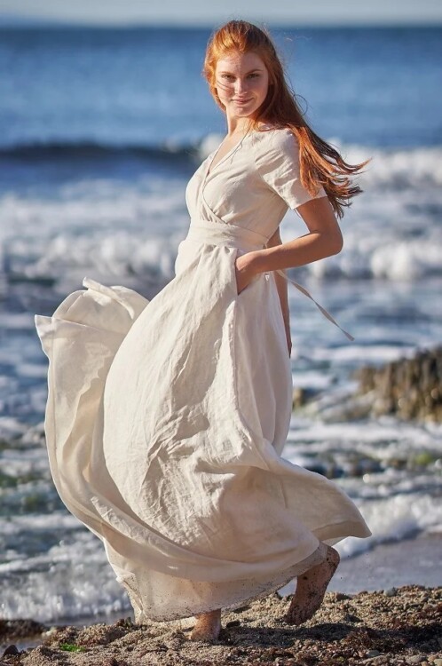 Модель, що нагадує халат із запахом і поясом і розкльошеною спідницею може бути зшите з льону. Виріб підійде струнким і повним. Фасон з запахом один з небагатьох, який ідеально підходить жінкам з фігурою «Яблуко». Сукню можна прикрасити вишивкою або контрастними стрічками для любительок народного стилю.