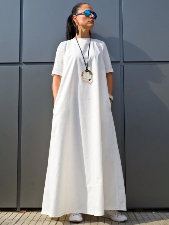 Ніхто не відмовиться від довгої широкої сукні з відкритими плечима. Її можна надягати як з поясом, підкреслюючи талію, так і без нього. В якості взуття підійдуть кеди, білі кросівки, Мюлі, босоніжки і влітку шльопанці.