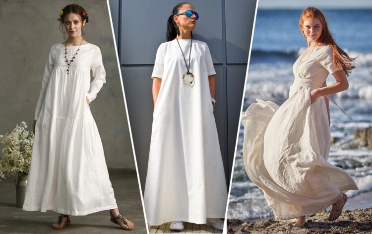 Модель, що нагадує халат із запахом і поясом і розкльошеною спідницею може бути зшите з льону. Виріб підійде струнким і повним. Фасон з запахом один з небагатьох, який ідеально підходить жінкам з фігурою «Яблуко». Сукню можна прикрасити вишивкою або контрастними стрічками для любительок народного стилю.