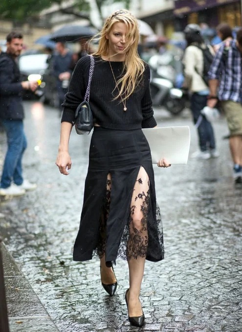 Одяг з останнього пункту відноситься до “найпристойніших”, якщо можна так висловитися. Якщо її непрозора частина доходить до колін, то прозора вставка вже точно не буде виглядати без смаку, особливо якщо таку річ поєднувати з чимось класичним: білою сорочкою, простим жакетом, стильним взуттям.