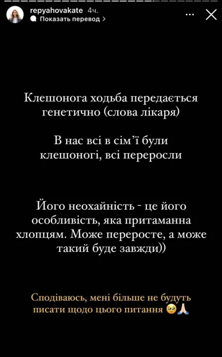 «Клишонога ходьба передається генетично (слова лікаря). У нас у родині були клишоногі. Усі переросли. Його неохайність — це його особливість, яка властива хлопчикам. Може переросте, а може таким буде завжди», — зазначила блогерка.