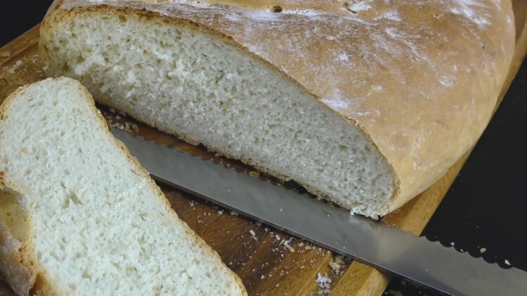 Відправляємо випікатися в заздалегідь розігріту до 190 градусів духовку на 35 хвилин. Я ставлю на середню полицю в режимі “верх-низ”. Добре пропечений хліб при постукуванні справляє враження порожнього. Перекладаємо остигати на решітку.Батон вийшов великий і мені знадобилося додатково 10 хвилин для його випічки, але вже при температурі 180 градусів.