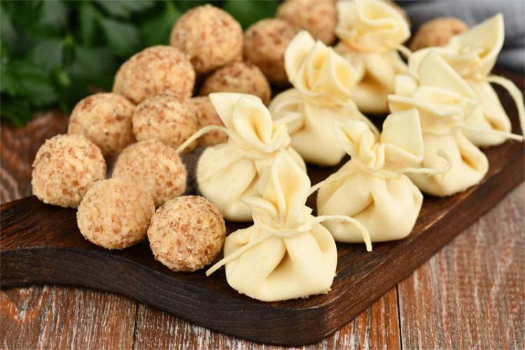 Готові сирні закуски розміщуємо на тарілці або дошці для сервування і подаємо на стіл. Їх можна розмістити з іншими сирами, вийде оригінальна та дуже гарна сирна тарілка. І мішечки, і ніжні кульки з чудовим смаком.
