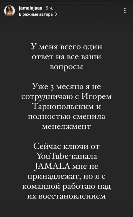 “У мене всього одна відповідь на всі ваші запитання. Уже три місяці я не співпрацюю з Ігорем Тарнопольським і повністю змінила менеджмент. Зараз ключі від YouTube-каналу Jamala мені не належать, але з командою працюю над їхнім відновленням”, – написала вона.