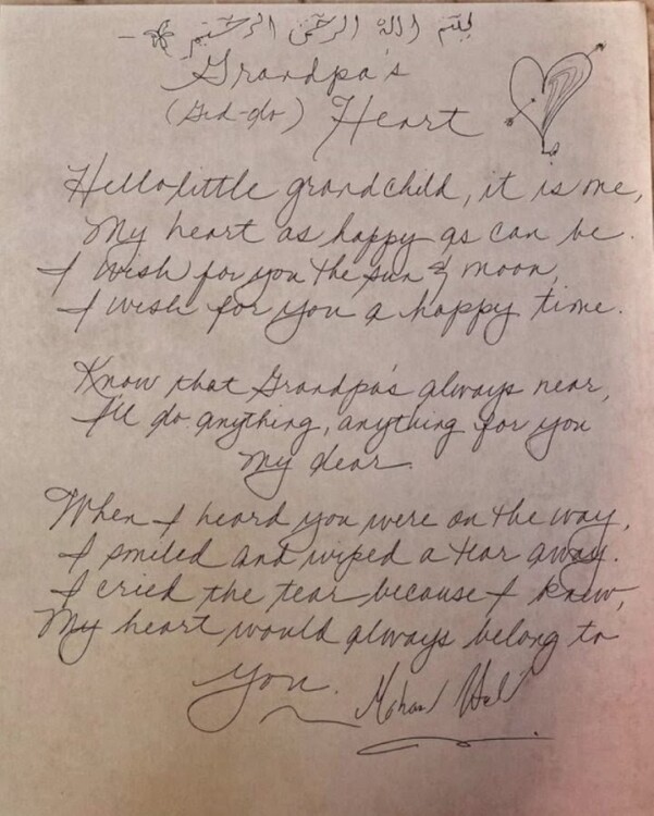 Він мило та ніжно назвав свою онуку, внучатком. Поділився емоціями щастя, побажав сонця та місяця і щасливого часу. Пообіцяв що дідусь буде завжди поруч та виконає будь-яке бажання своєї онуки. Після того, як батько почув про народження онуки на очах його замайоріли сльози, а обличчя переповнилась усмішкою. Сльози виступили від думки, що серце батька Мохамеда завжди буде належати онучці.
