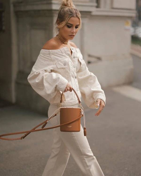 На перші осінні дні, коли прохолода не така чутлива, можна підібрати собі джинсову куртку бежевого кольору з відкритими плечима, що робить жіночий образ романтичним і незабутнім. Втім, таку модель можна буде носити і пізніше, додавши нижній шар у вигляді водолазки або светра.