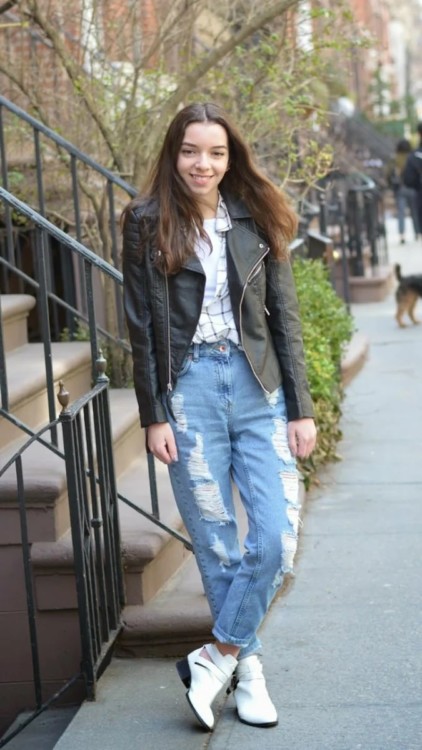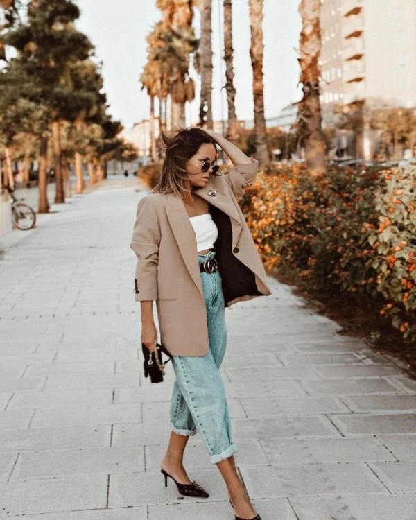 Напевно, у більшості модниць в арсеналі присутній блейзер або піджак. Поєднуйте джинси даного фасону з моделлю будь-якої довжини, не забувши при цьому завершити образ взуттям на підборах.