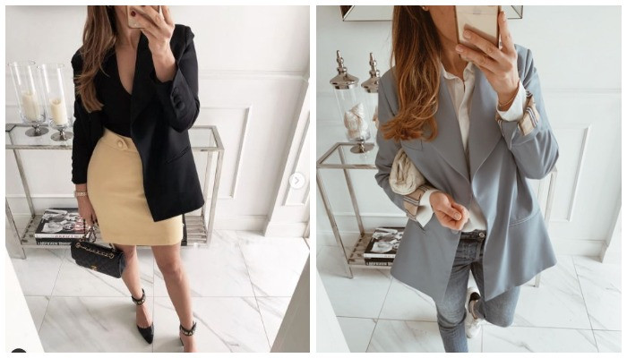 Додайте до будь-якого образу жакет і отримаєте нову, абсолютно іншу сучасну картинку. Дивіться, як повсякденний кежуал look з джинсами скінні, білою сорочкою і кросівками перетворився завдяки благородному світло-блакитному жакету.