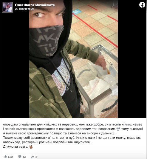 Проте, 25 жовтня у одному з ресторанів співак разом зі своєю коханою з’явилися без захисних масок. Також, музикант у своєму фейсбуці поділився інформацією про те, що він ходив на виборчу дільницю.