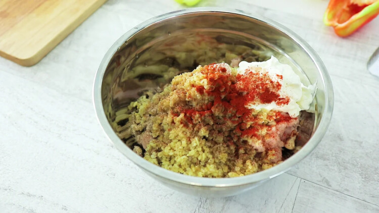 Готові гриби з цибулею додаємо до фаршу. Далі відварений булгур, сметану, сіль і спеції за смаком. Все добре перемішуємо і начинка готова.
