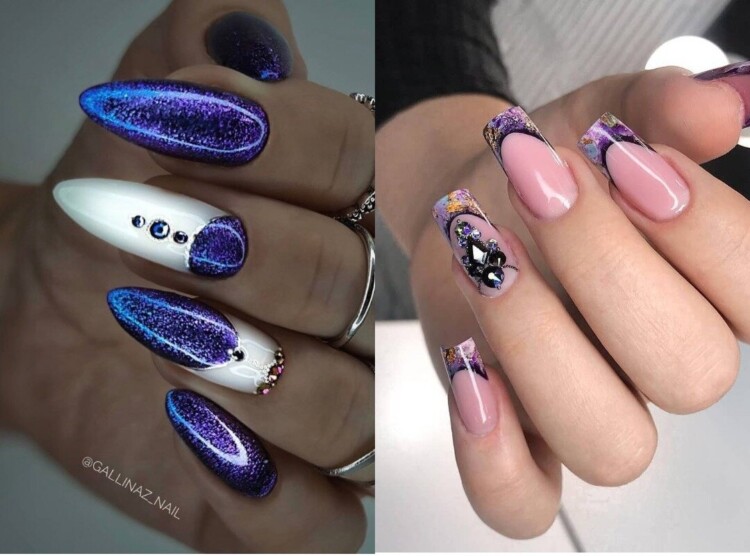 Неймовірно розкішний і статусний манікюр можна створити, якщо з’єднати фіолетовий френч з чорним лаком. Доповнивши дизайн стразами, ви зробите свої нігті предметом захоплення.