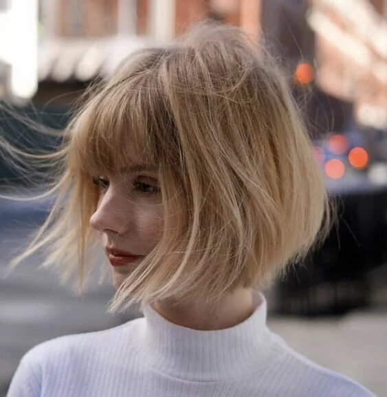 Рваний чубчик – мастхев нинішнього сезону. Вона поєднується з будь-якою довжиною волосся. Подивіться на цей приклад злегка рваного боб-каре і градуйованого чубчика. Щоб образ виглядав гармонійно, на кінчиках теж необхідно зробити легке градуювання.
