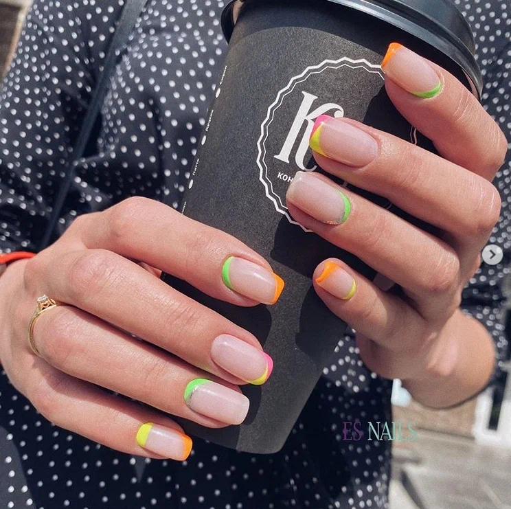 Яскравий, різнокольоровий френч незмінно знаходиться в топових варіантах дизайну в сезоні весна і літо, оскільки багато жінок воліють робити саме його, а не однотонний або різнокольоровий манікюр у яскравих тонах.