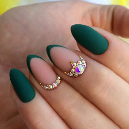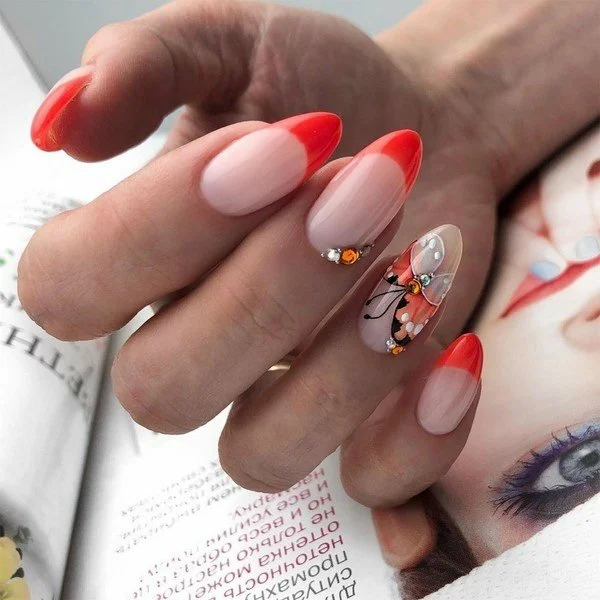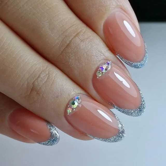 Симпатично виглядає французький манікюр з кінчиками нігтів, виконаних з ефектом омбре. Доповнити його можна різними кристалами або глітером, що додасть йому ще більшої ефектності.