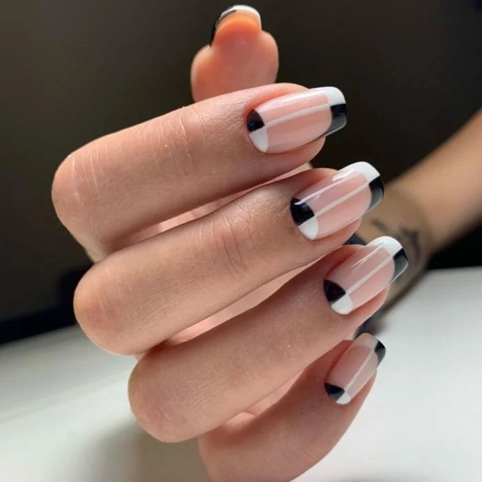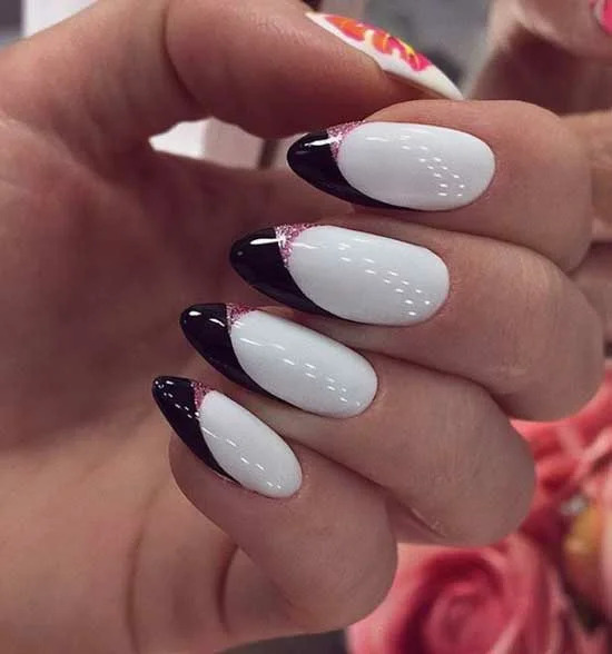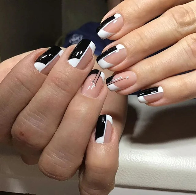 Френч в класичних чорно-білих кольорах підійде як для будь-якого наряду, так і приводу. З такими нігтиками ви цілком можете відправитися і на роботу в офіс, і на святковий захід. При цьому нудним його назвати не можна, якщо правильно пограти фарбами.