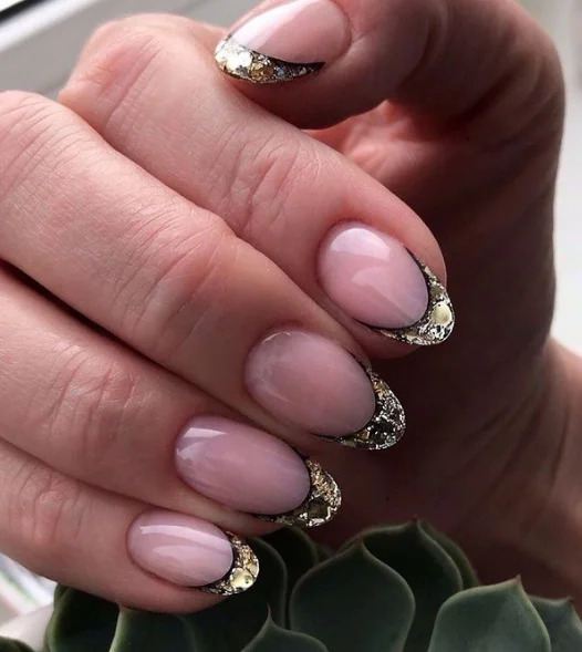 Відмінний варіант для святкового сету – французький манікюр, кінчики в якому викладені блискучими паєтками або блискітками. Такий надзвичайно заворожує і виглядає інтригуючи.