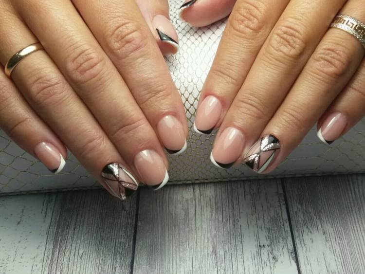 Френч можна наносити на нігті із різними дизайнами. Серед них особливе місце приділяється варіанту з геометрією. На перший погляд може здатися, що тонка плавна лінія і фігури не поєднуються між собою, але це не так.