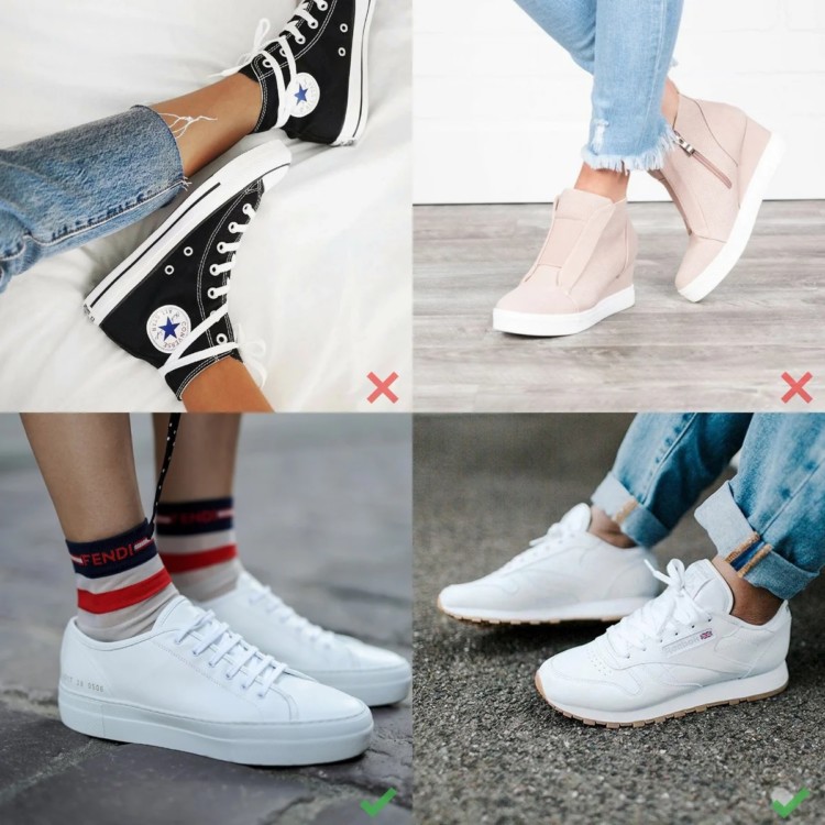 Кросівки на танкетці або з імітацією каблука вийшли з моди кілька років тому, але, чомусь, багато як і раніше продовжують купувати це дивне взуття. По-перше, кросівки на танкетці виглядають мило тільки на маленькому розмірі ноги, у всіх інших випадках виглядають масивно і безглуздо. По-друге, вищими вас такі кросівки навряд чи зроблять. Щоб злегка збільшити ріст, вибирайте взуття на високій підошві, але без застарілої імітації каблука.