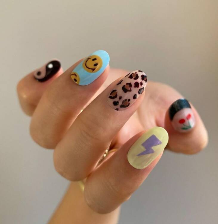 У кожного нігтя – свій дизайн. Скажімо, жовтий смайлик на безіменному пальці, символ інь-ян – на вказівному і анімалістичний принт – на мізинці. Виходить начебто випадковий набір, але разом виглядає органічно. Цей майстер може малювати від руки або використовувати наклейки.