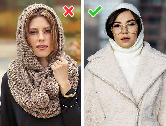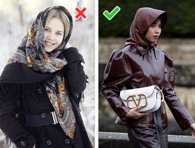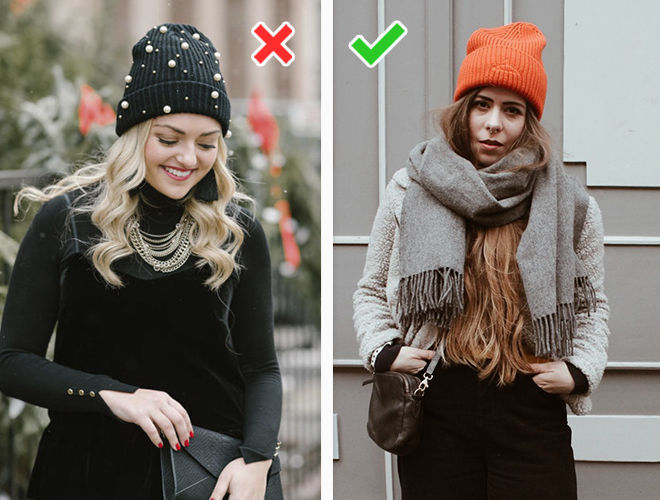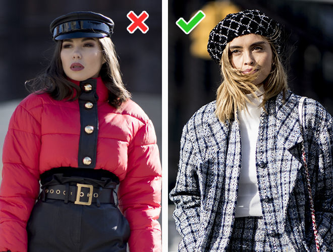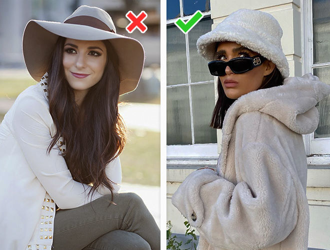 Капелюшки ще як актуальні в новий холодний сезон, тільки не такі безформні, як на фото зліва. М’які поля застаріли, вони виглядають неохайно. Такий капелюх можна замінити на модель з жорсткими, неширокими полями або вибрати трендову альтернативу – хутряну панаму. Стильний головний убір урізноманітнює наші образи і зробить їх набагато цікавіше.