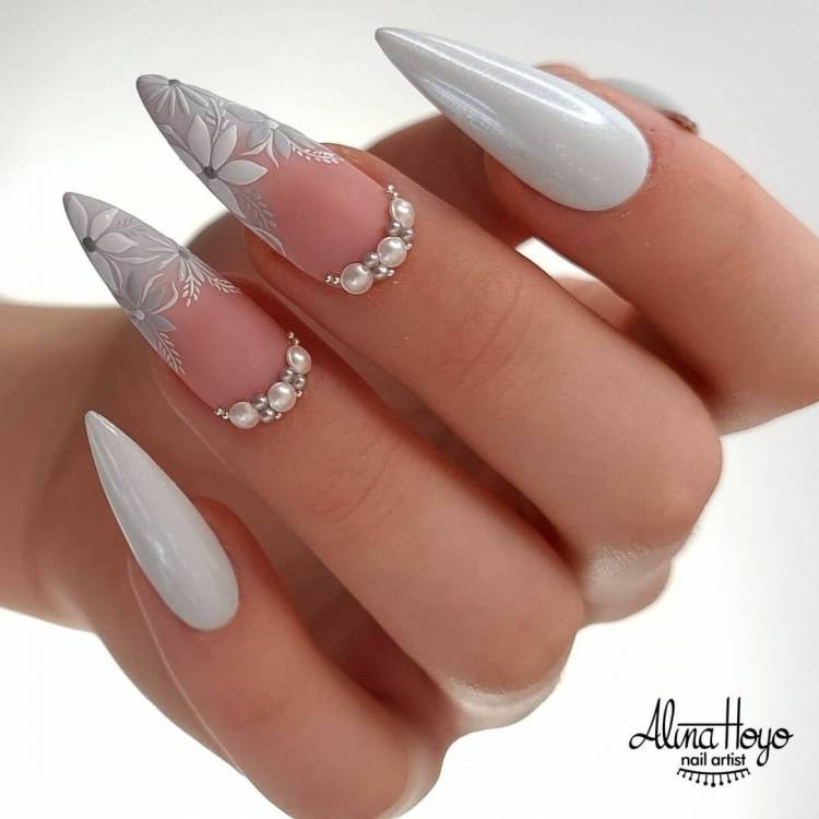перли – зробіть манікюр перламутровим лаком і приклейте ефектні перлинки, одну або розсипом;