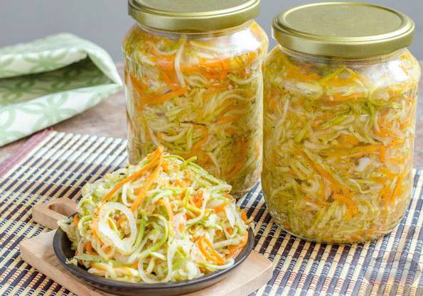 Нарізаємо кабачки та моркву тонкими довгими смужками, часник – дрібненькими кусочками. На сковороді на олії смажимо часник протягом хвилини, потім прибираємо його. Додаємо цукор із різаним гострим перцем та кабачками. Смажимо ці інгредієнти та постійно помішуємо приблизно 2–3 хвилини. Заливаємо соєвим соусом, перемішуємо, знімаємо з вогню і залишаємо під кришкою на 10 хвилин.