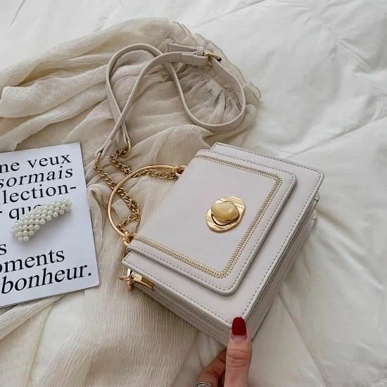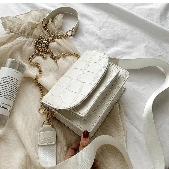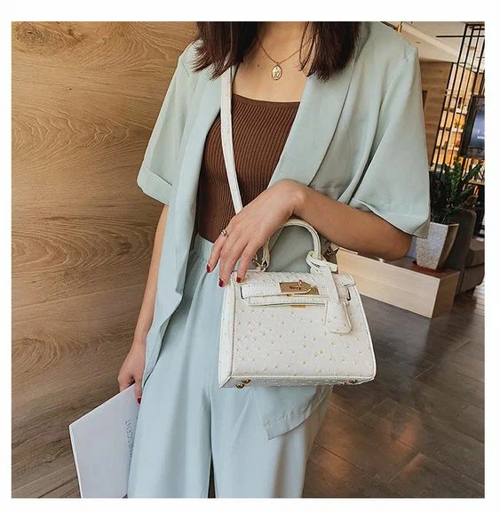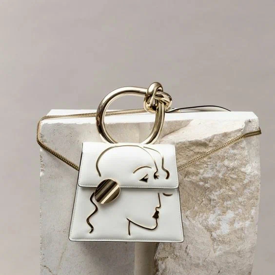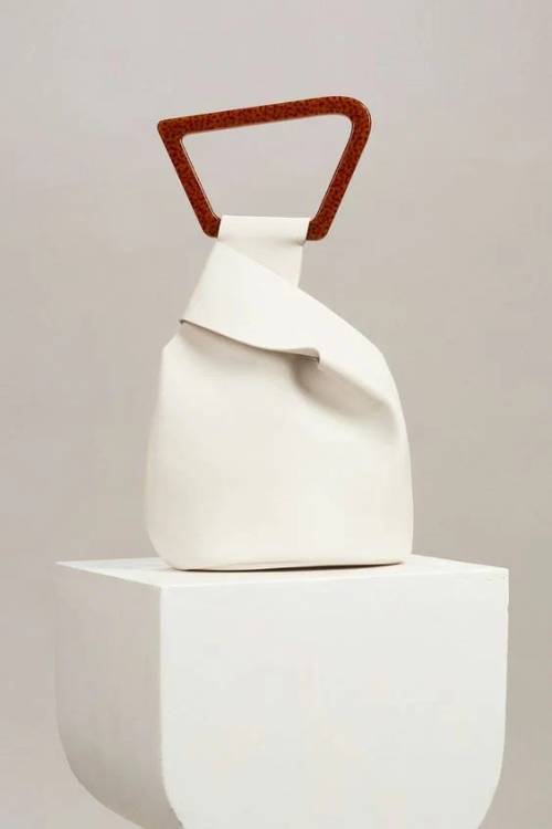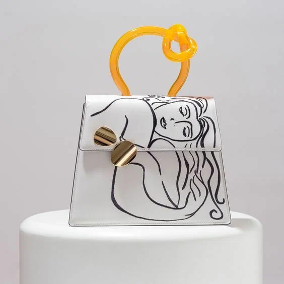 Перед вами ще один тренд – це біла сумка з контрастними абстрактними зображеннями. Яскраві ручки та виразна фурнітура – чудова прикраса літніх сумочок.