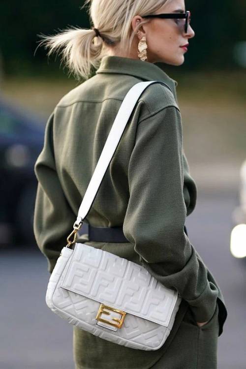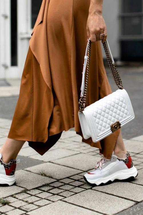 Стьобаний клатч білого кольору із золотою фурнітурою – тренд, який уже не перший рік на піку популярності. Ви тільки подивіться, як подібного плану сумка стильно виглядає з громіздкими кросівками.