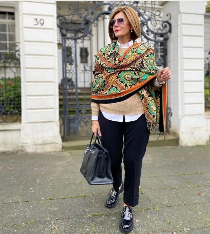 Щоб вбрання не виглядало нудно можна урізноманітнити їх цікавими деталями. Наприклад, барвистою хусткою, як на 6 фото. Так вбрання стане ще затишніше та ефектніше. Цей прийом добре працює у випадку, коли потрібно врятувати образ із хистким старомодним светром. Так що не варто зневірятися, якщо маєте такий у своєму гардеробі.