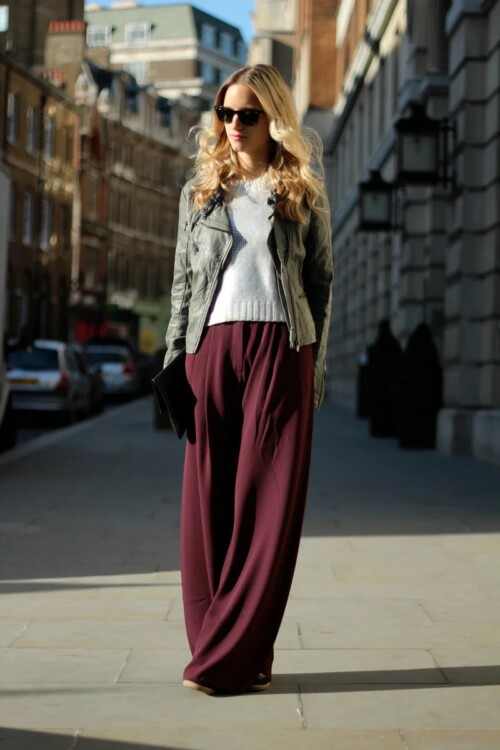 Підходять широкі штани як для офісних, так і повсякденних сетів. Компонувати такі рекомендується з приталеними блузами, тонкими светрами або ж водолазкою.