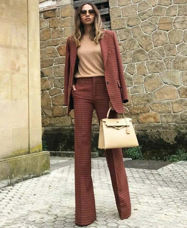 Якщо є проблема зайвої ваги, вибирайте брюки в світлих тонах, де клітина представлена ”гусячою лапкою”. Подібне поєднання зробить фігуру стрункішою.