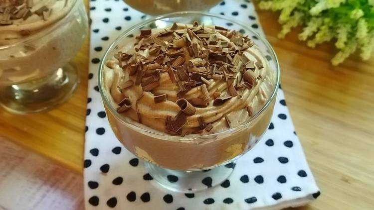Перекладаємо крем у кондитерський мішок. У креманки викладаємо трохи крему, а потім додаємо печиво. Усього буде три шари крему та два шари печива. Зверху присипаємо подрібненим шоколадом.