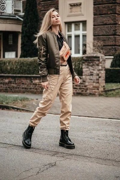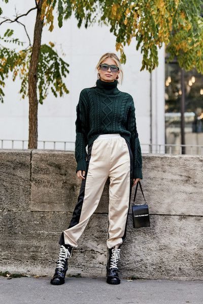 При поєднанні грубих черевиків зі спортивними штанами можна легко створити цікавий і привабливий кежуал образ. Моделі штанів вибирайте на свій смак. Верх бажано доповнити светром оверсайз, лонгслів або світшот.