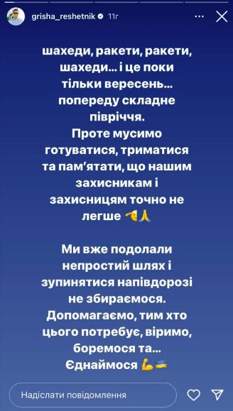 “Шахеди, ракети, ракети, ракети, шахеди… І це поки лише вересень. Попереду складне півріччя” – зазначив Гриша.