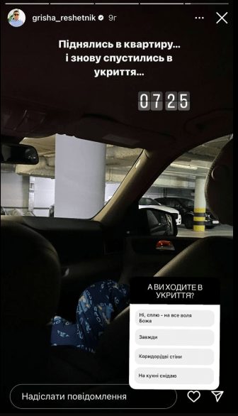 Гриша зізнався, що під час першої тривоги вони з дружиною та дітьми спустилися у паркінг. Згодом вони повернулися в квартиру, проте, зовсім згодом їм знову довелося спускатися в укриття.