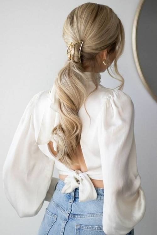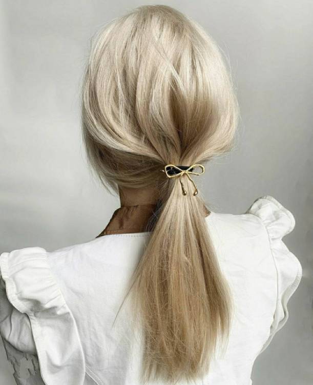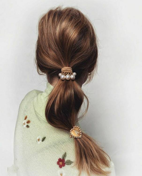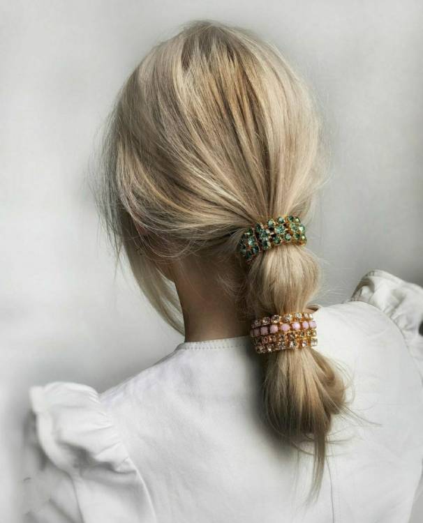 Низький недбалий хвіст, підв’язаний тонкою лаконічною гумкою з легкою прикрасою. Якщо хочете привнести в образ незначну, але стильну деталь, то це відмінний вибір.