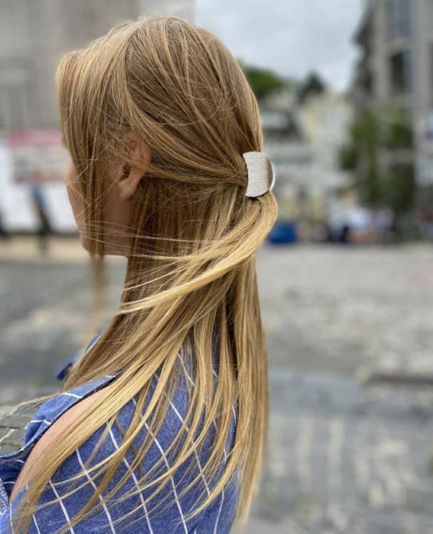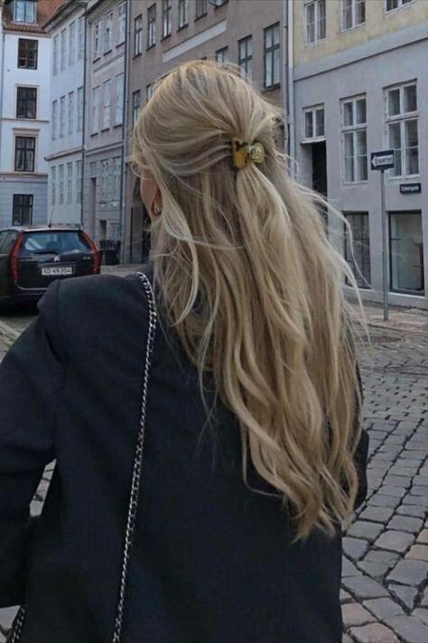 Ще один “пучок наполовину” на довгому волоссі. Образ виходить милим і грайливим, але вибирайте лаконічні гумки з хороших матеріалів, щоб не здешевити свій вигляд.