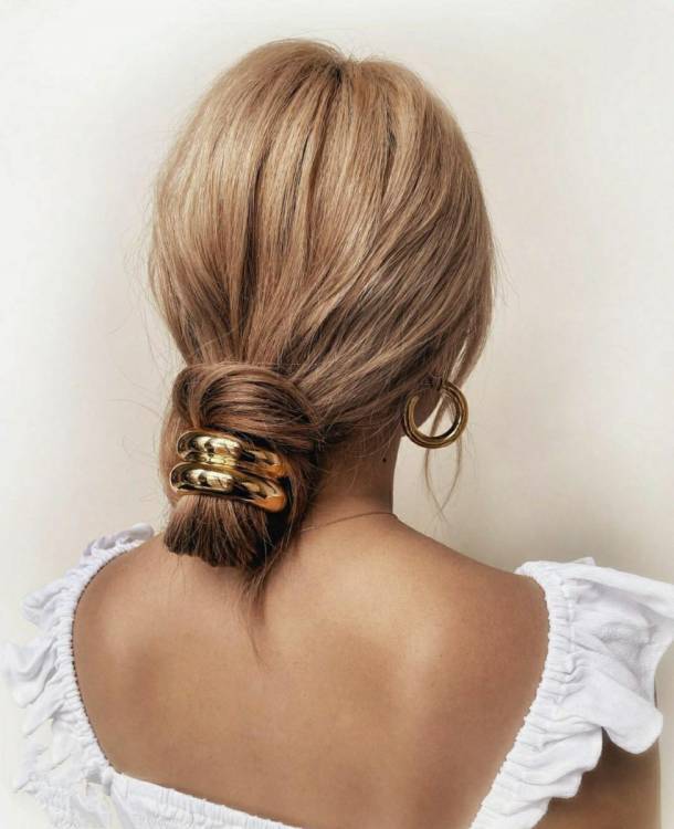 Гумки-шпильки такого плану, схожі на великі металеві прикраси, дуже популярні зараз. Головне, вибрати лаконічний аксесуар без “викрутасів”. Можна зробити звичайний низький хвіст або такий розслаблений пучок.