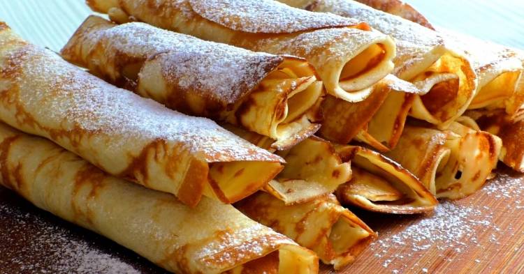 Потім кожен млинець загортаємо в трубочку. Посипаємо цукровою пудрою.
