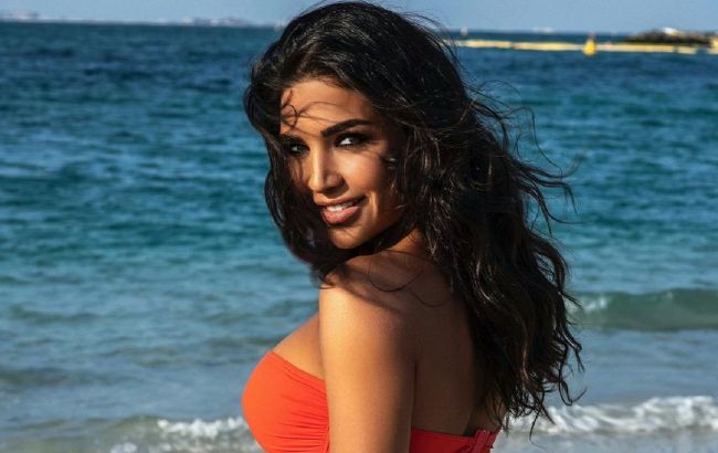 Артистка позувала на піску на тлі моря в бікіні коралового кольору без бретелей. Жаркий лук доповнюють темні окуляри і розпущене волосся.