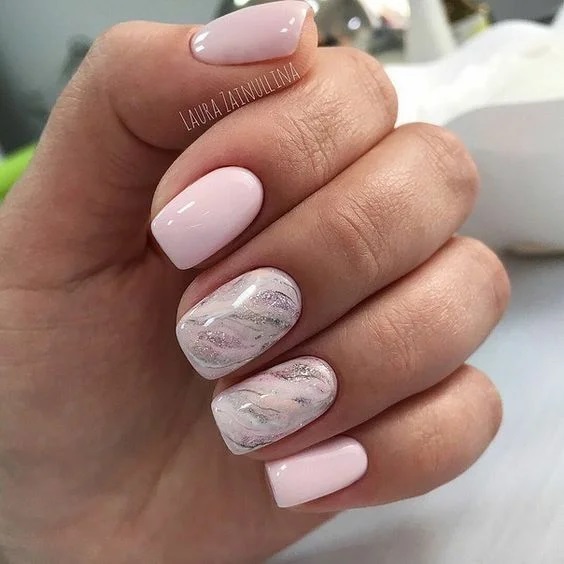 Щоб ніжний манікюр заграв новими фарбами і виглядав більш виразно, його досить доповнити втіркою, блискітками, стразами, а також фольгою. Щоб не перевантажувати загальний вигляд сучасного елегантного манікюру, строкатий і блискучий дизайн досить використовувати на одному або декількох пальчиках.
