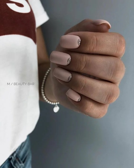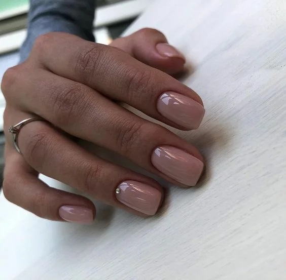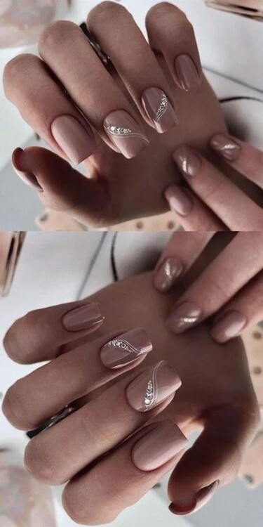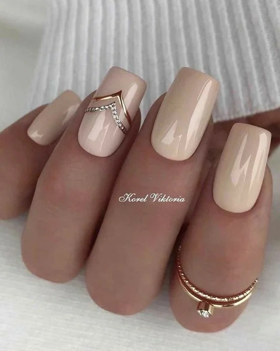 Однотонне ніжно-бежеве полотно можна сміливо прикрасити за допомогою золотого дизайну з блискітками. У 2020 році особливу популярність має мінімалістичний універсальний манікюр, досить додати страз на безіменний пальчик і ваш трендовий манікюр буде відповідати всім останнім тенденціям моди.